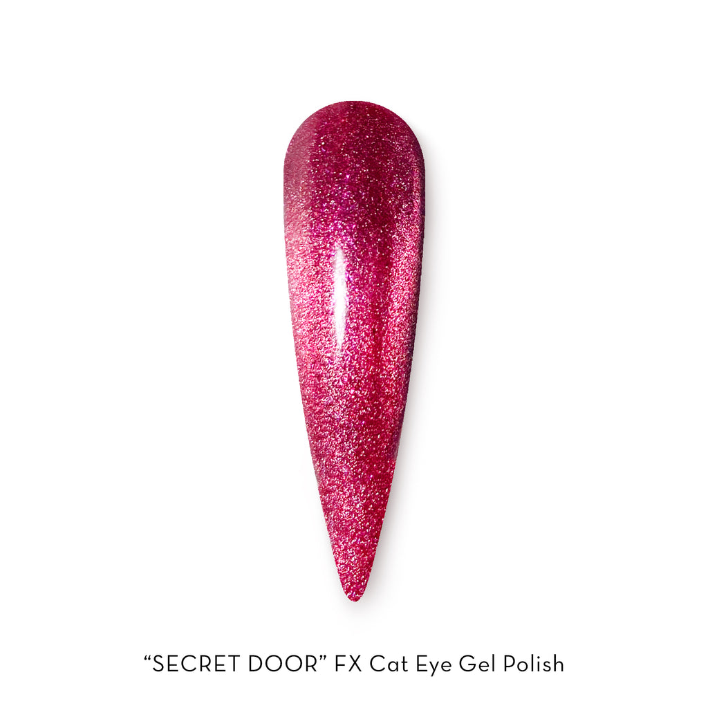 Secret Door is a cranberry metallic when applied without the Cat Eye effect. With the Cat Eye effect it's a cranberry glass with red and bright pink micro glitter.