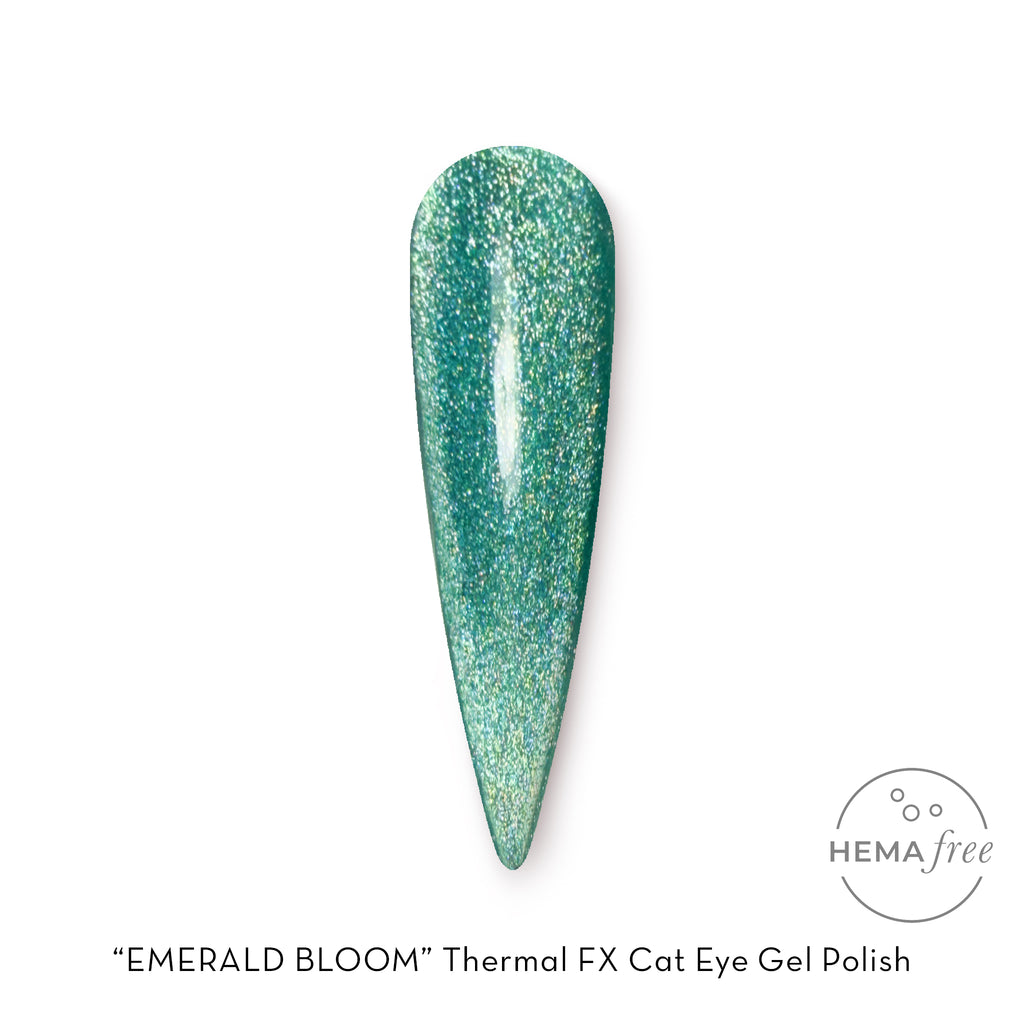 Emerald Bloom (Thermal Colour Changing) A vibrant teal that shifts to a lush green with warmth, accented by a radiant opal cat eye effect. This dynamic gel polish captures the essence of new growth and blooming gardens, perfect for embracing the energy of spring.