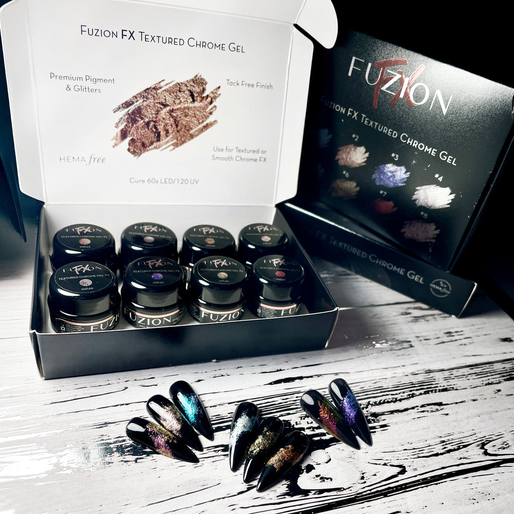 Fuzion FX Textured Chrome Gel is changing the game! This unique HEMA Free art gel can be used to create stunning texture and dimension to your nail designs.