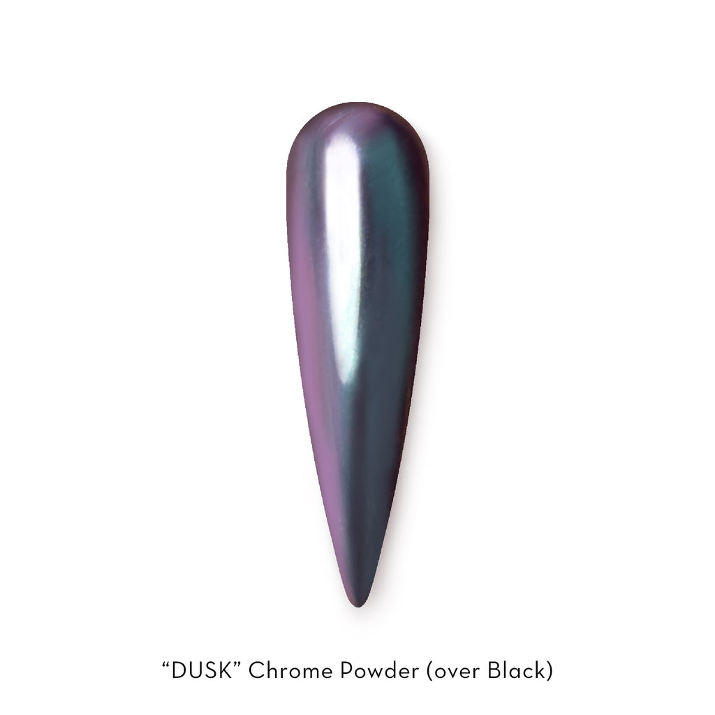 Dusk Chrome Powder - a mesmerizing iridescent purple-blue chrome that shifts like the sky as stars begin to peek through. Mysterious, tranquil, and full of depth—just like the lake after dark.