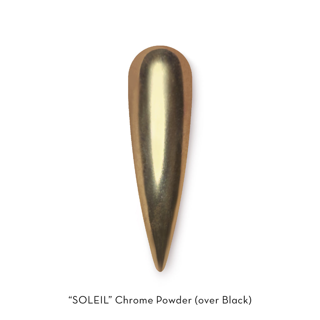 Soleil Chrome Powder – a soft yet radiant gold chrome that shimmers like sunlight dancing on calm water. Elegant and warm, it’s the golden kiss between day and night.