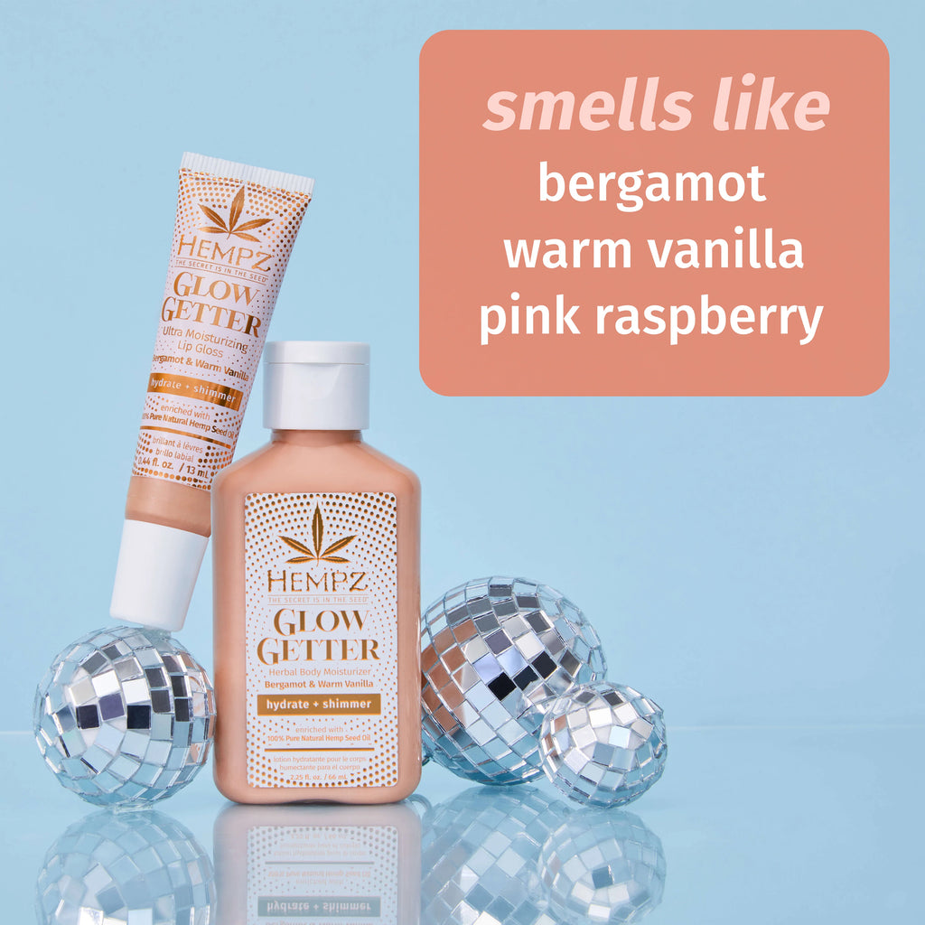 A gorgeous Glow Getter duo to add shimmer and softness to your skin and lips! The moisturizing body lotion leaves skin silky and sparkling with ethically sourced mica, while the lip gloss adds a subtle shine and comfy softness. Enchanting bergamot and amber scents make this set your perfect holiday glow!