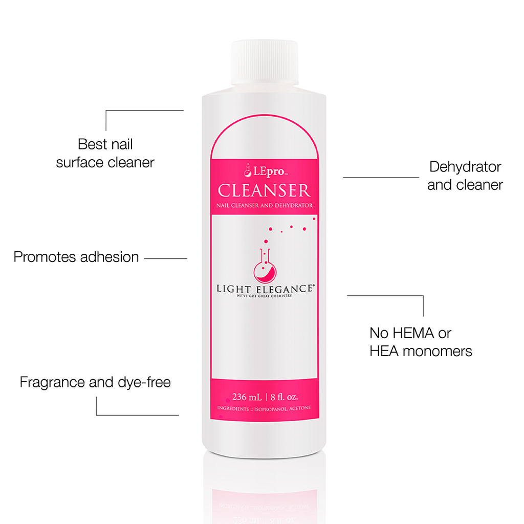 Cleanser does not contain fragrances or dyes that remain on the nail to impair the bonding of Light Elegance to the nail.