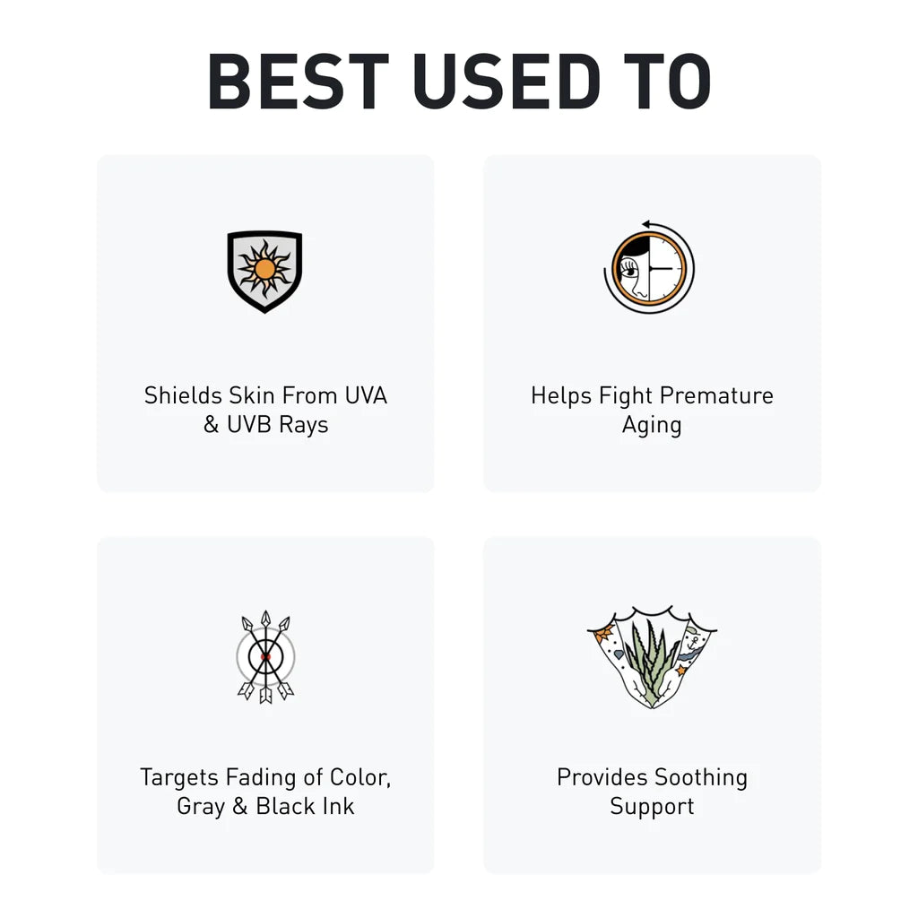 Our natural and moisturizing broad-spectrum sunscreen is SPF 30 and creates an invisible shield against environmental damage - including UVA/UVB rays, stressors like pollution and free-radicals, which result in discoloration, fading of tattoo ink pigment, and premature aging.
