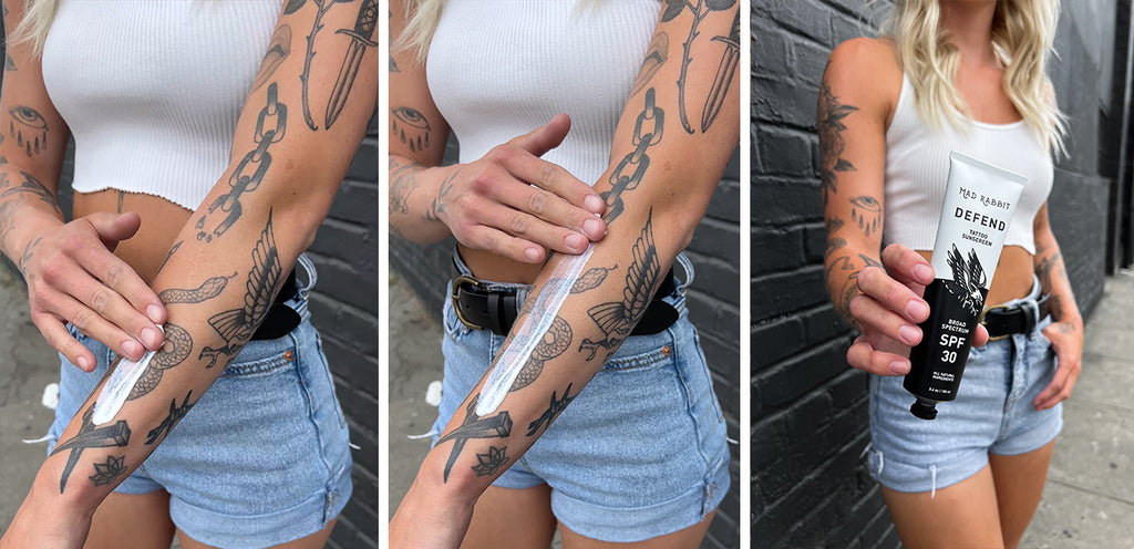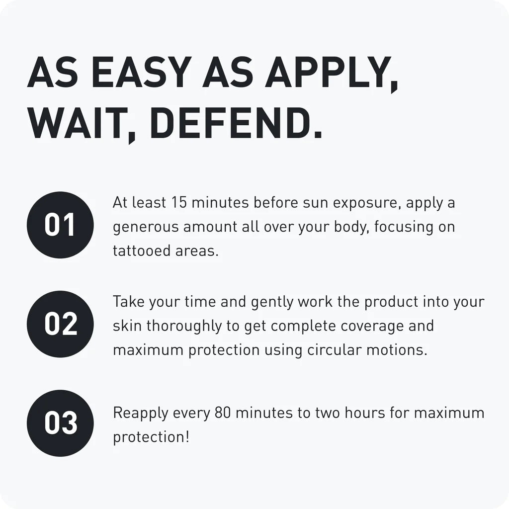 1. At least 15 minutes before sun exposure, apply a generous amount all over your body, focusing on tattooed areas. This will give the product enough time to absorb into your skin and provide optimal protection. Be sure to use enough sunscreen to fully cover all exposed areas of your body, including your tattooed areas.