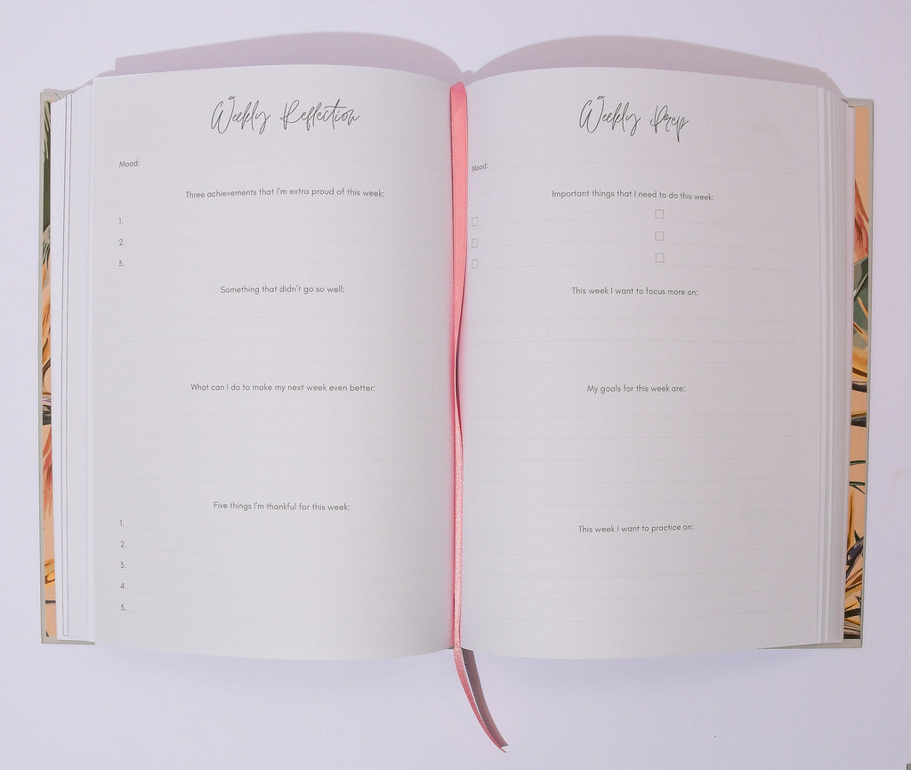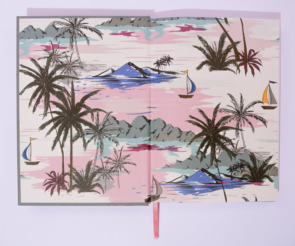 Beautifully bound book with dark gray cover, color print, gold embossing, elastic cover ribbon and pink silk ribbon.