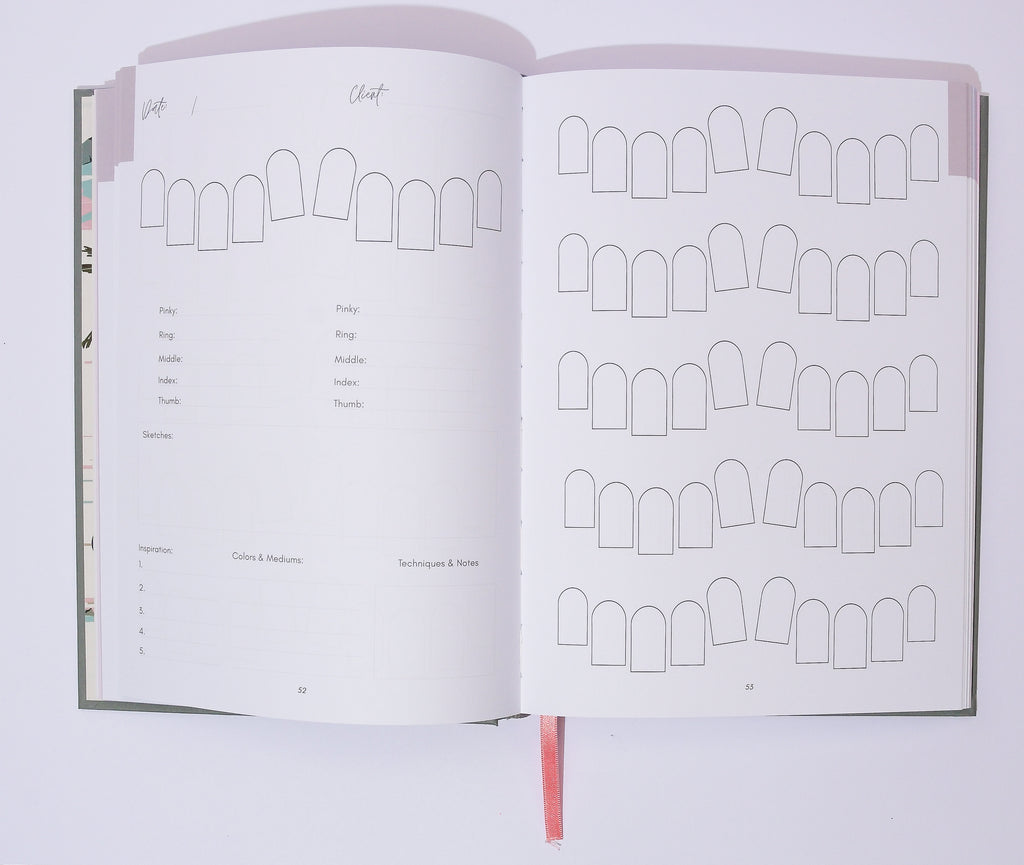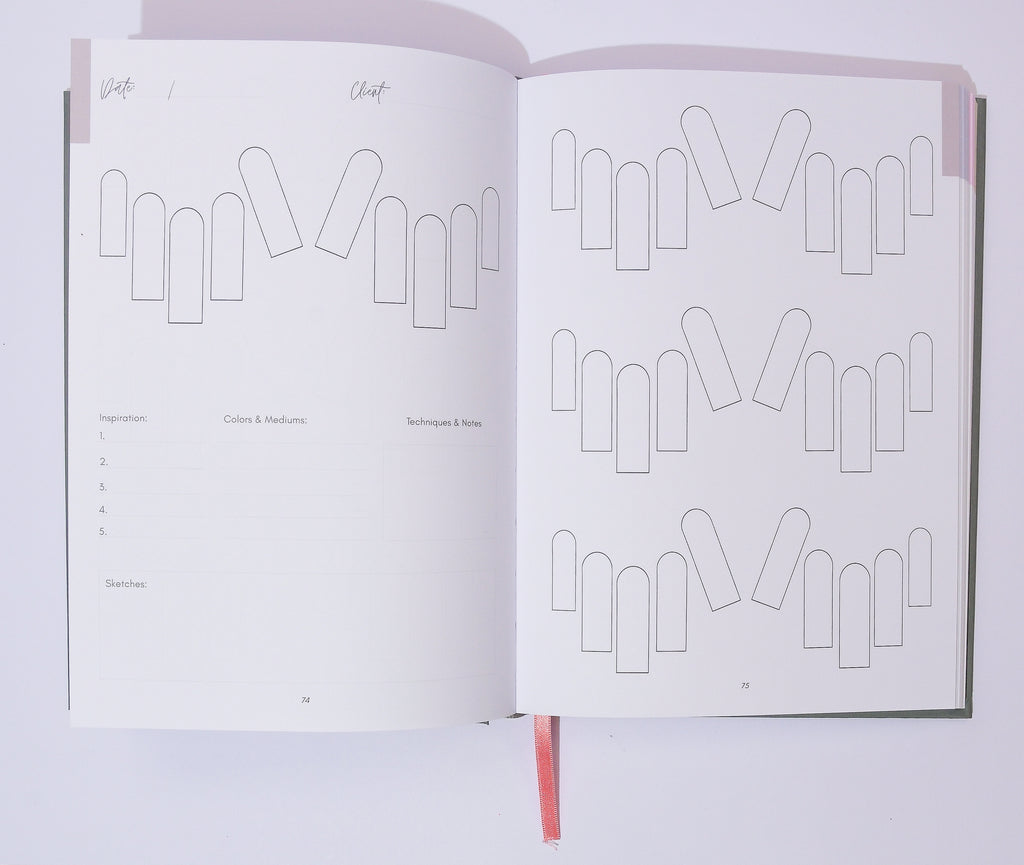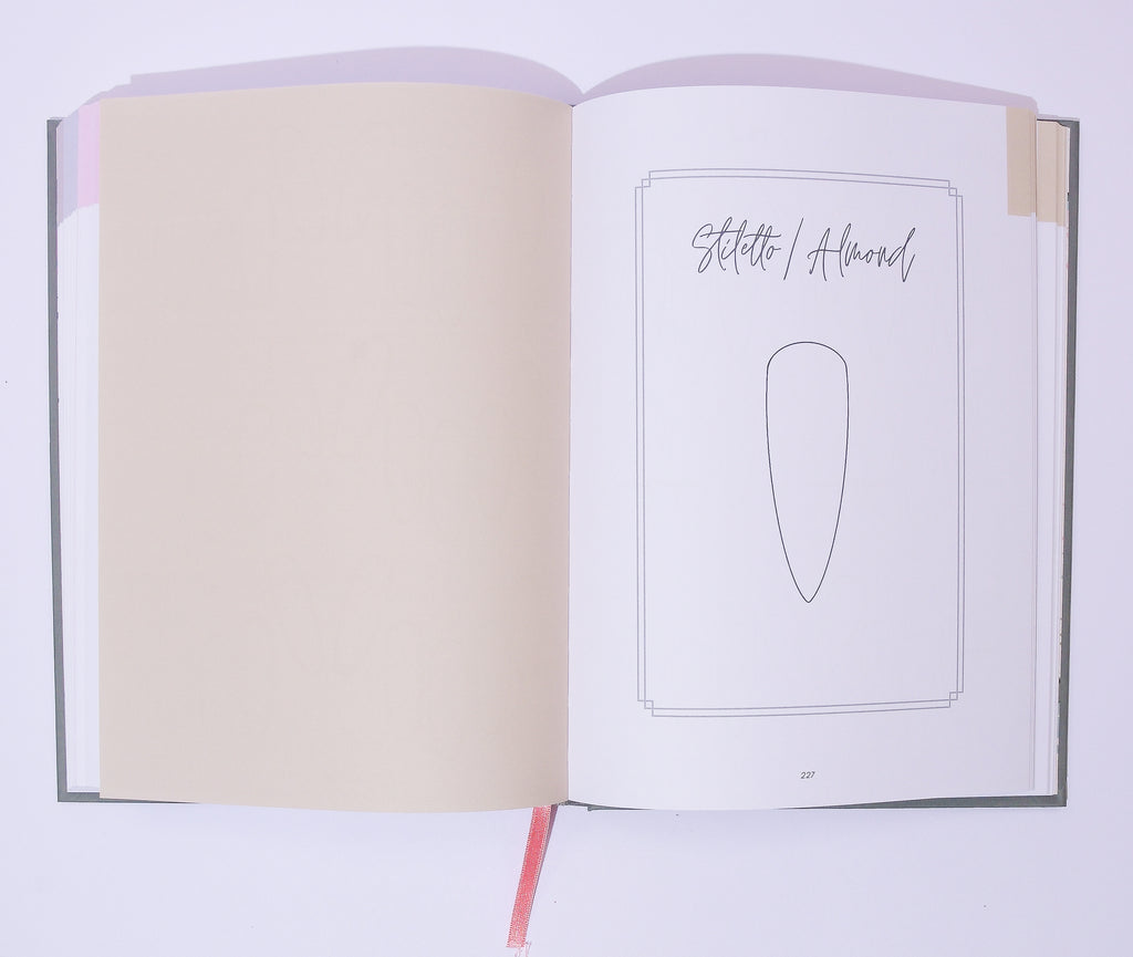 “When I sit at the salon with clients, I have a note book with loads and loads of unreadable scribbles of designs that I’ve made. It’s messy and I would never be able to find a specific design or understand what products and techniques I’ve used. In this design book I start off by sharing my best tips and tricks on how to find inspiration, talking about tools, how to charge for nail art and other pages that will help you and spark your creativity and finding your personal style. The rest of the book is filled with shapes of nails and lines to fill in the date, the client’s name, products used, inspiration, etc. This way when a client walks in with an old nail image you posted a decade ago, you can easily find it in your book and recreate it.